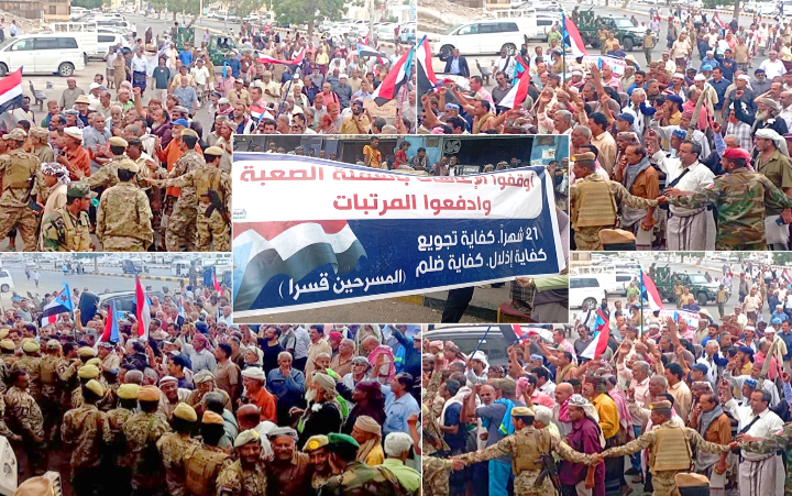 المسرحون قسرا يدشنون مرحلة جديدة لاستعادة حقوقهم من امام بوابة القصر الرئاسي في معاشيق