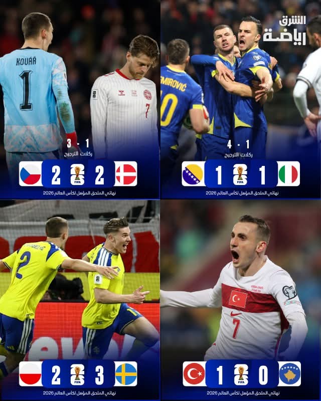 رسمياً.. أسفرت مباريات نهائي الملحق الأوروبي عن تأهل كل من تركيا والسويد والبوسنة والهرسك والتشيك إلى نهائيات كأس العالم 2026.