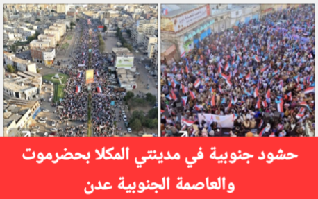 صورتان للحشود الجنوبية في مدينتي المكلا حاضرة حضرموت والعاصمة الجنوبية عدن تجسدان التحدي والإصرار، وتعكسان بوضوح إرادة شعب الجنوب في رفض القهر والظلم وكل أشكال الوصاية والهيمنة الاحتلالية.